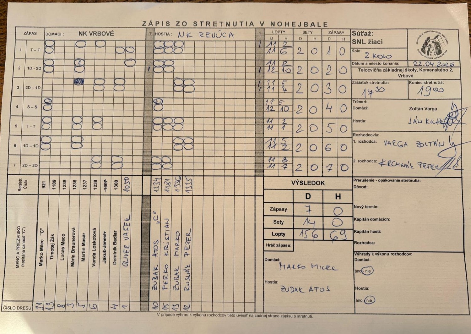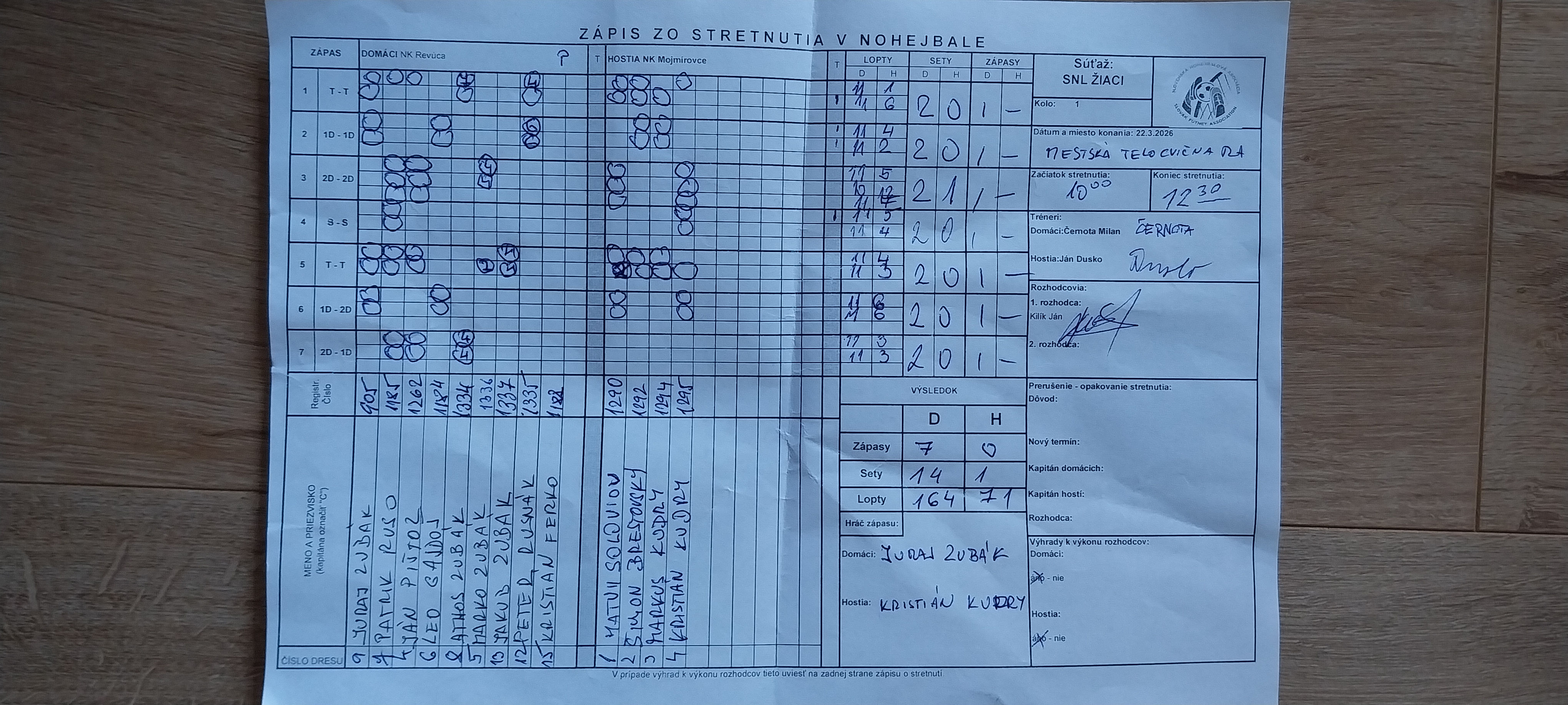 | 3 | NK Revúca | 2 | 1 | 1 | 7:7 | 14:15 | 233:227 | 3 |
